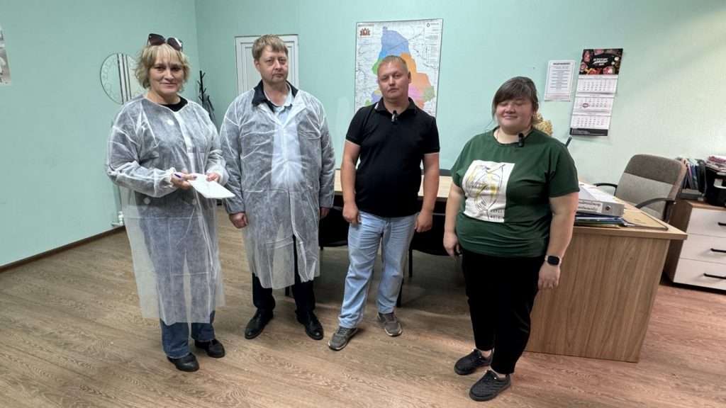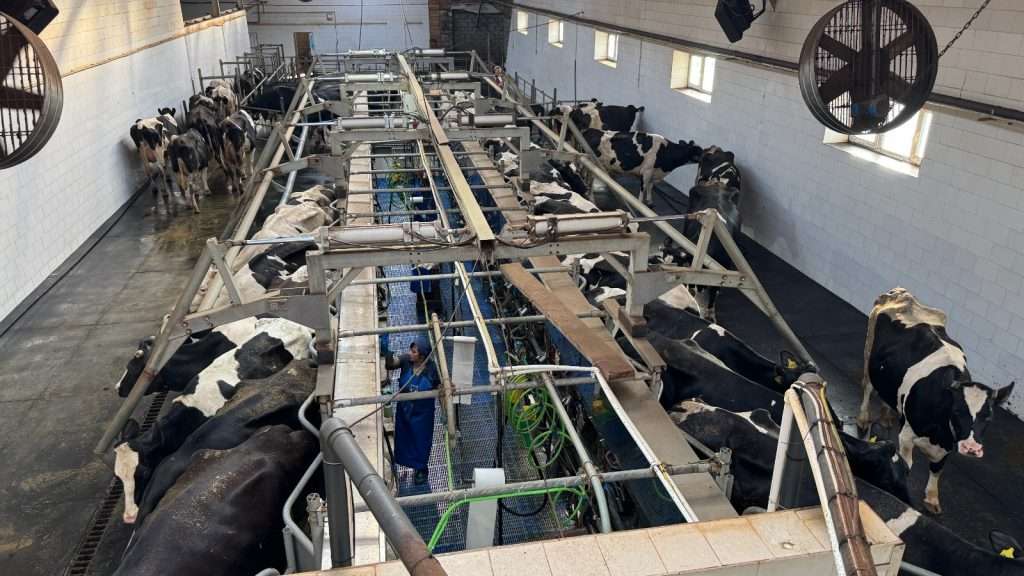 Далее нам показывают сердце фермы — молочный корпус, где непосредственно производится дойка коров и хранение готового молока. Предварительно нам всем выдают стерильные белые халаты, ведь здесь чистота не только в приоритете, но и главное требование. Молочный корпус размещается в двухэтажном помещении. На первом бытовые комнаты, аппарат «Елочка», где осуществляется дойка, и помещение с 3 танками — огромными 10-тонными емкостями, где охлаждается и хранится молоко. Каждый имеет по 4 вентилятора: чем быстрее охлаждается молоко, тем больше сохраняется его качество. На завод оно отправляется охлажденным до 4,4 градусов. В доильном цехе работает по два оператора, всего 6 человек. За 22-23 смены их заработная плата составляет 100 тыс. рублей в месяц. Но, вздыхает руководитель СПК, очередь из желающих не стоит у двери. К сожалению, люди неохотно идут в сельское хозяйство, их отучили от этого за прошедшие десятилетия.