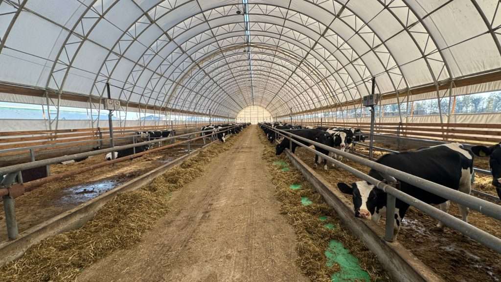 Показали нам «святая святых» хозяйства. Фермы издалека похожи на что угодно, но только не на те старые коровники, темные и грязные, с едким запахом навоза. Вблизи мы рассматриваем металлические конструкции, обтянутые мягким материалом: на потолке и по всему периметру панорамные окна, которые зимой и в морозную погоду закрываются. Алексей Павлович рассказывает, что животные прекрасно чувствуют себя в таком помещении. В зимнее время для них оптимальная температура от нуля до плюс пяти градусов, даже для суточных телят. Самое главное, чтобы было сухо, поэтому здесь глубокая подстилка.