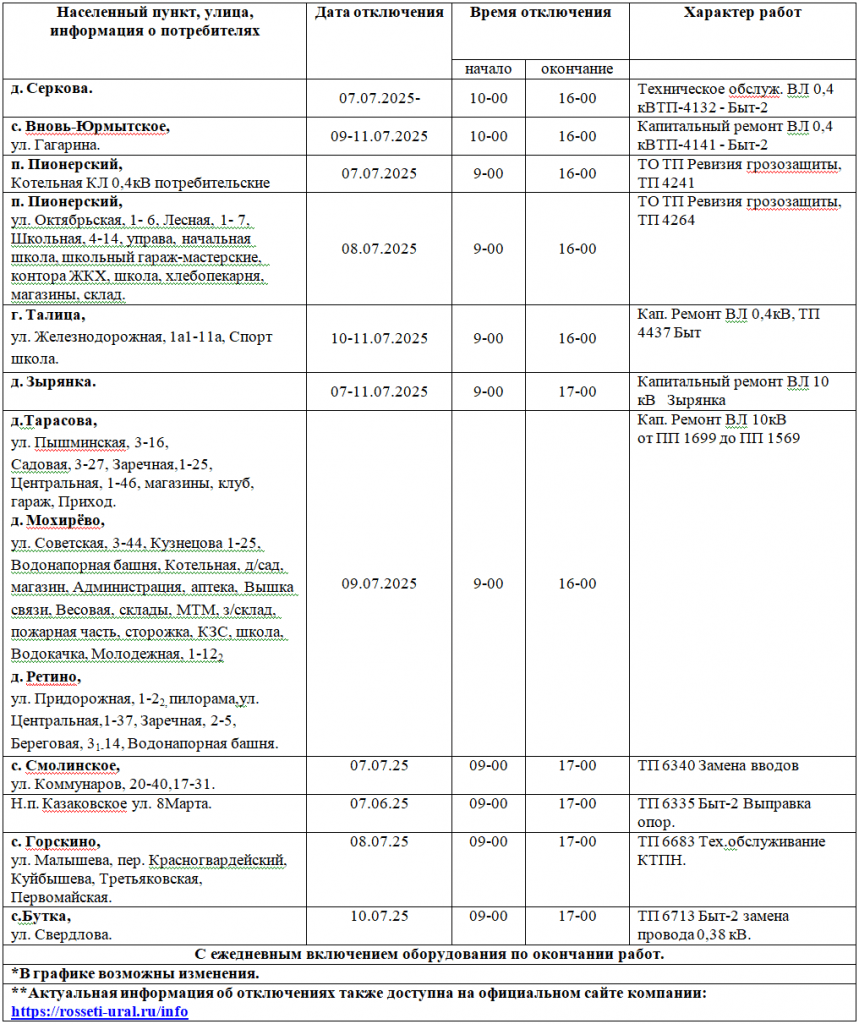 ПО «Талицкие электрические сети»Свердловского филиала ПАО «Россети Урал» доводят до Вашего сведения график плановых отключений электроэнергии на период с07.07.2025 по 11.07.2025, связанных с проведением ремонтных работ на электросетевом оборудовании. Просим принять во внимание данную информацию при планировании Вашей хозяйственной деятельности: