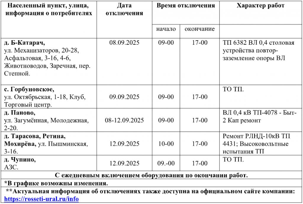ПО «Талицкие электрические сети» Свердловского филиала ПАО «Россети Урал» доводят до Вашего сведения график плановых отключений электроэнергии на период с 08.09.2025 по 12.09.2025, связанных с проведением ремонтных работ на электросетевом оборудовании. Просим принять во внимание данную информацию при планировании Вашей хозяйственной деятельности: