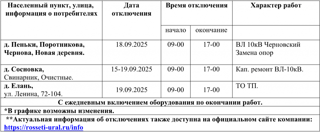ПО «Талицкие электрические сети» Свердловского филиала ПАО «Россети Урал» доводят до Вашего сведения график плановых отключений электроэнергии на период с 15.09.2025 по 19.09.2025, связанных с проведением ремонтных работ на электросетевом оборудовании. Просим принять во внимание данную информацию при планировании Вашей хозяйственной деятельности: