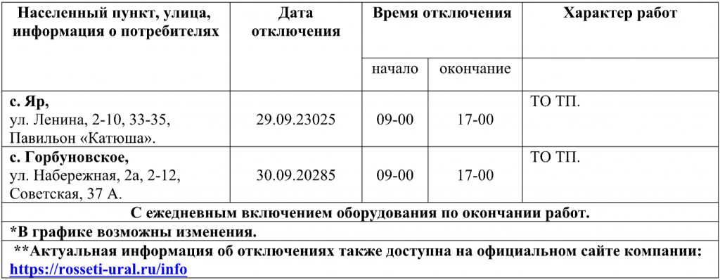ПО «Талицкие электрические сети» Свердловского филиала ПАО «Россети Урал» доводят до Вашего сведения график плановых отключений электроэнергии на период с 29.09.2025 по 03.10.2025, связанных с проведением ремонтных работ на электросетевом оборудовании. Просим принять во внимание данную информацию при планировании Вашей хозяйственной деятельности: