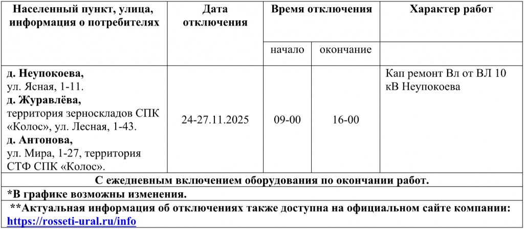 ПО «Талицкие электрические сети» Свердловского филиала ПАО «Россети Урал» доводят до Вашего сведения график плановых отключений электроэнергии на период с 24.11.2025 по 28.11.2025, связанных с проведением ремонтных работ на электросетевом оборудовании. Просим принять во внимание данную информацию при планировании Вашей хозяйственной деятельности: