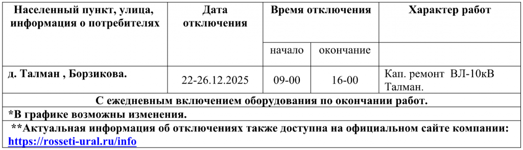 ПО «Талицкие электрические сети» Свердловского филиала ПАО «Россети Урал» доводят до Вашего сведения график плановых отключений электроэнергии на период с 22.12.2025 по 26.12.2025, связанных с проведением ремонтных работ на электросетевом оборудовании. Просим принять во внимание данную информацию при планировании Вашей хозяйственной деятельности: