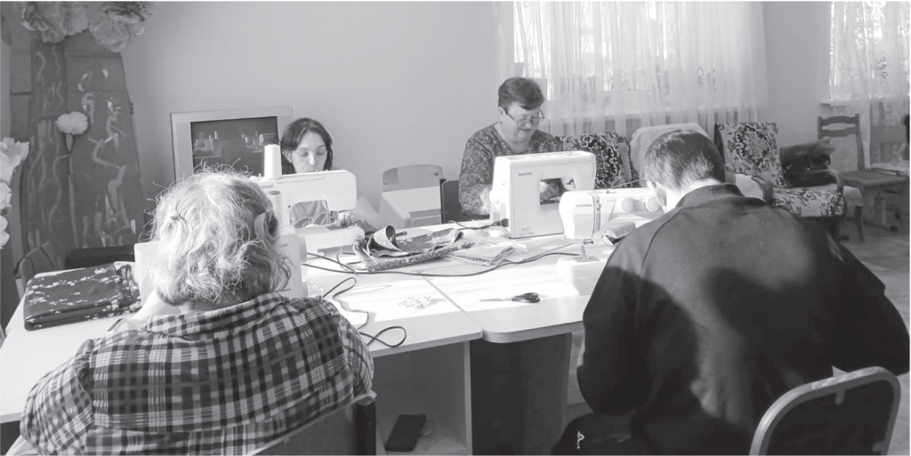 В швейной мастерской трудятся 7 человек, есть колясочники (двое мужчин), шьют на заказ постельное белье, кухонные полотенца, прихватки. Швейные машины и оверлок купили за счет полученных гранта и субсидий.