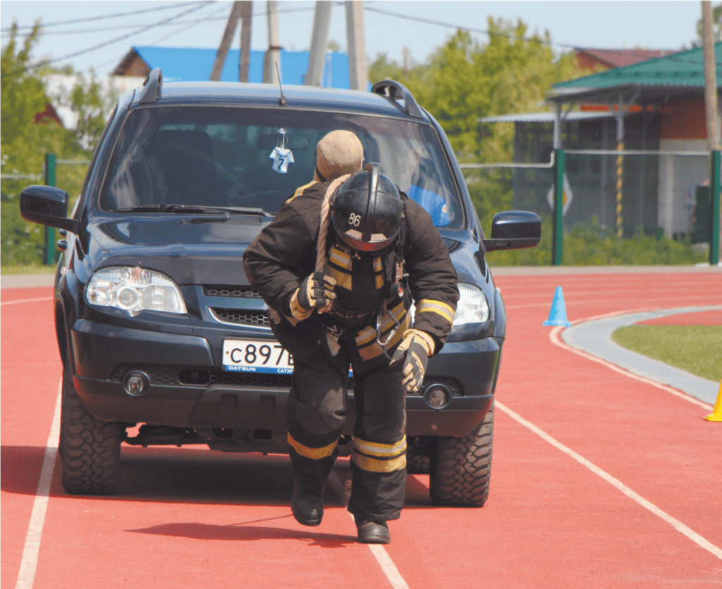 Согласно условиям, все участники выступали в полном боевом облачении пожарного. Шлем, теплозащитные куртка и брюки, спасательный пояс с карабином и топором, тяжелые резиновые сапоги, краги, кислородный баллон — общий вес экипировки превышает 25 кг. Помимо тяжелого снаряжения, сложностей добавила, и жаркая погода… Испытания включали в себя махи гирей весом 16 кг, подъем гирь 24 кг, приседания с последующим подъемом штанги, отжимание, кантование покрышки от грузового автомобиля, прокладку магистральной линии на два рукава с последующим ее сбором (восьмеркой) и возвратом на линию старта. В этом году были исключены другие виды спорта, т.к. уже скоро состоятся областные соревнования, и по результатам данного кроссфита будет сформирована сборная команда 59 ПСЧ.