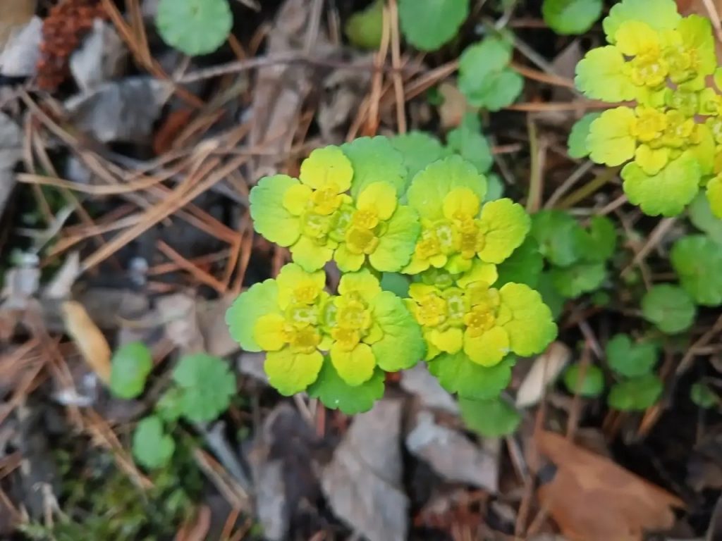 Селезёночник очереднолистный. Настоящий водохлёб! Его сочные зелёные листья и мелкие жёлтые «звёздочки» идеально чувствуют себя у ручьёв. Детям было особенно интересно узнать, почему растение так назвали (форма листьев напоминает почки животного, в древности растение использовали в качестве лекарственного средства при болезнях селезёнки).