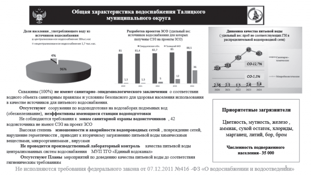 — Проблема обеспечения населения качественной питьевой водой — одна из приоритетных. И она остается достаточно острой. Так в Талицком МО в 2024 году санитарно-эпидемиологические заключения о соответствии санитарным правилам проектов зон санитарной охраны получены только для 36 (СО — для 88,5%) источников централизованного водоснабжения из 66. Кроме того, 40,3% проб питьевой воды из распределительной водопроводной сети по санитарно-химическим показателям (в 3,2 раза хуже показателя СО) не соответствуют требованиям гигиенических нормативов (основные загрязнители — цветность, мутность, железо, аммиак, сухой остаток, хлориды, марганец, литий, бор, бром). По микробиологическим показателям – процент неудовлетворительных проб 3,4, это ниже, чем в СО, но больше, чем в предыдущие годы на территории Талицкого района.